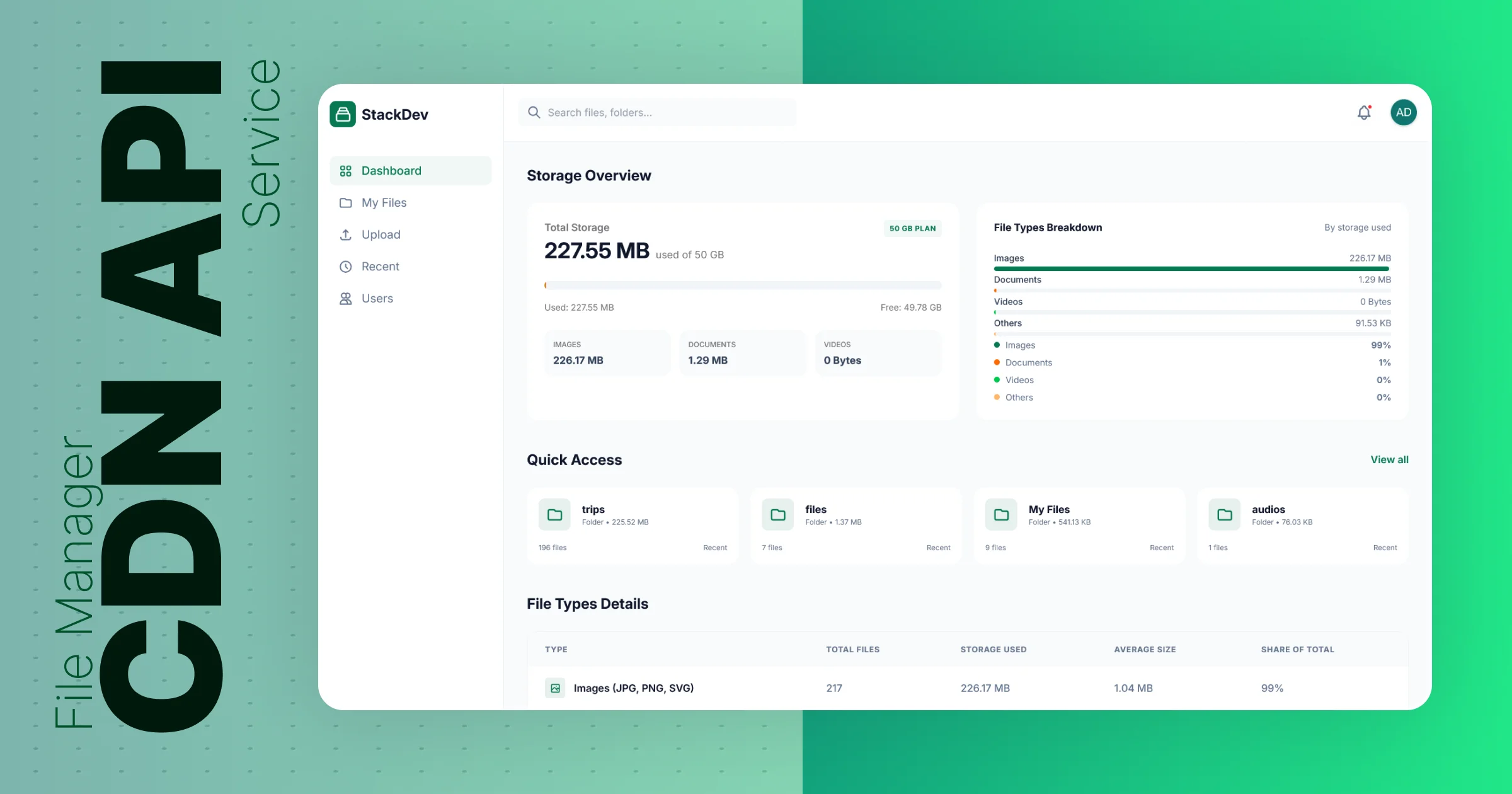 CDN API is a production-ready content delivery network service that provides intelligent image optimization, secure file storage, and efficient asset management. Built with modern web technologies, it offers both a RESTful API and a web-based dashboard for managing your digital assets.